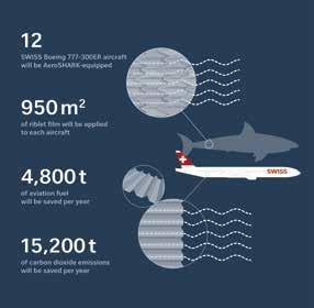 SWISS is the world’s first airline to deploy the innovative AeroSHARK technology on passenger flights. The transparent riblet film applied to the aircraft’s fuselage and engine replicates the hydrodynamic skin of a shark and lowers both inflight fuel consumption and carbon dioxide emissions.