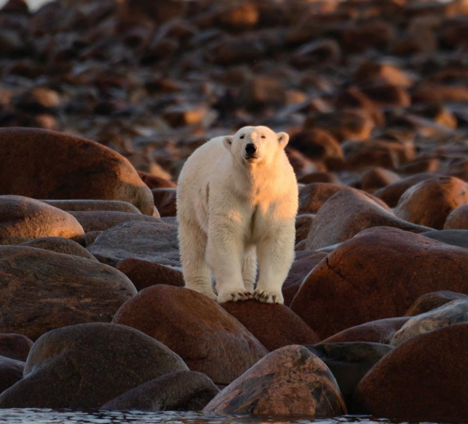 Opposite: Traditional boats on the shores of Haida Gwaii. Above: A polar bear in the Hudson Bay, where the animals migrate in the fall season.
