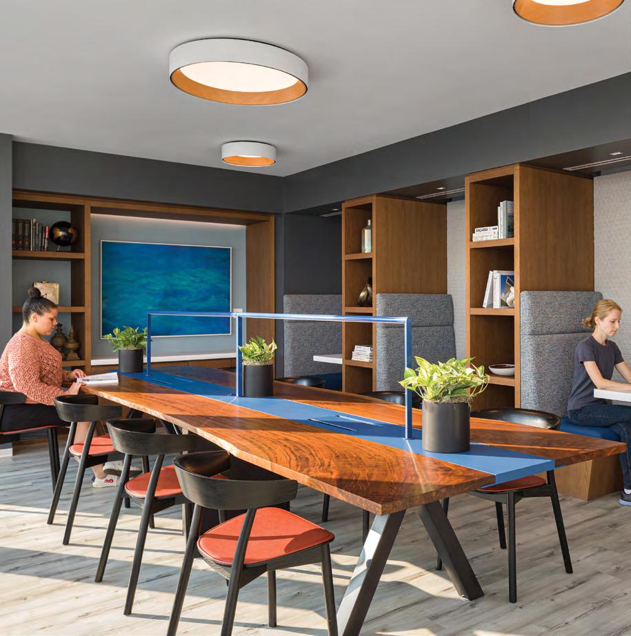 Pre-pandemic, employees didn’t need a reason to come to the office, you just came in to sit down at a desk to work. Now, with the help of technology, independent work can happen anywhere, which means employees need a reason to come in—be it a social event, a team meeting, or a quiet space to work in a phone room. As a result, compa nies are prioritizing community spaces, meeting spaces, and individual quiet spaces as they reconfigure their offices.
