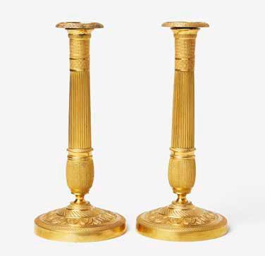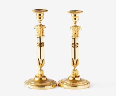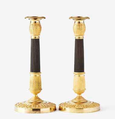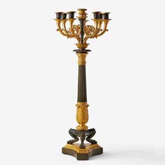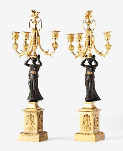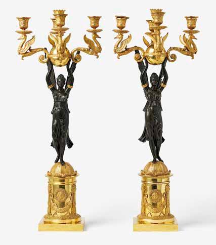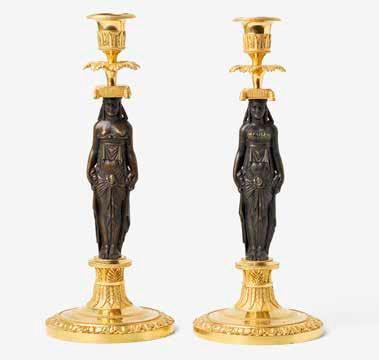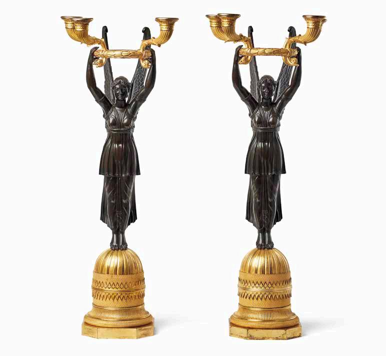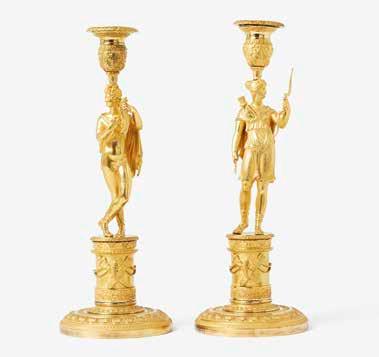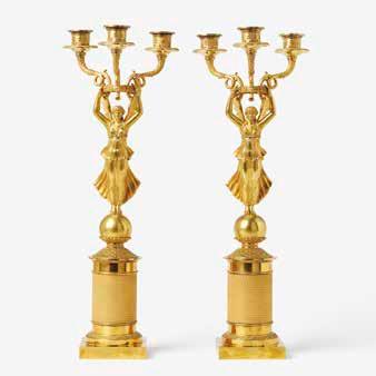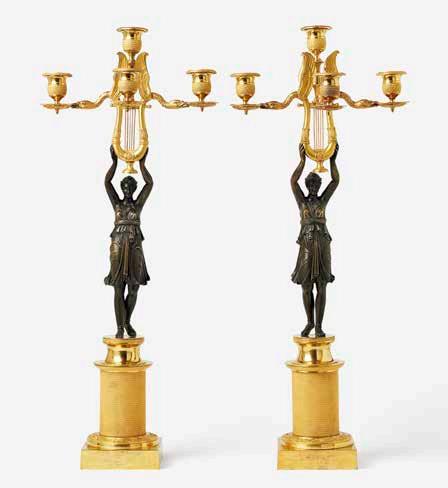 6. Ljusstakar, ett par, parisarbeten i empire, 1800–talets första kvartal, parställda, matterad och polerad brännförgylld brons, i av Diana och Apollon.