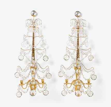 Behängda med droppar, knappar och ovaler, väggfäste med vädurshuvuden, utsvängda ljusarmar med räfflade droppskålar, urnformade ljuspipor, konisk slät stam med kannelering, fasettslipat spjut krönt av båge med plym samt knappformad prisma, höjd 82 cm.