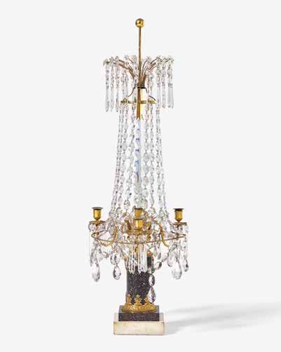 3. Bordslyster, sengustavianskt stockholmsarbete, omkring 1800, Fredric Ludvig Rungs art, för tre ljus, brännförgylld brons och mässing, Blybergsporfyr och Gammelklitt från Elfdahls Porphyrverk.
