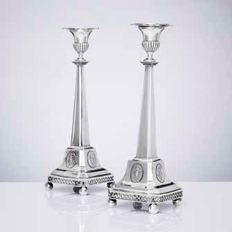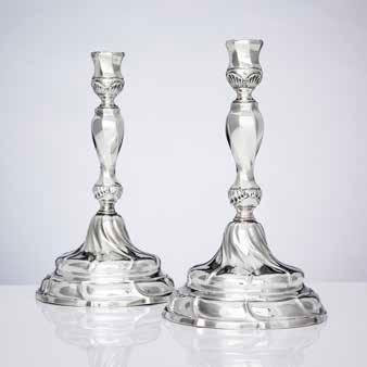 Rund fotplatta med bladstav, postament med emblem av Amors attribut pilbåge, koger och fackla, krönta av jaktgudinnan Diana respektive Apollon, ljuspipor med blomsterfestonger och Diana respektive Dianas ansikten, lösa manschetter, höjd 30,5–31 cm.
