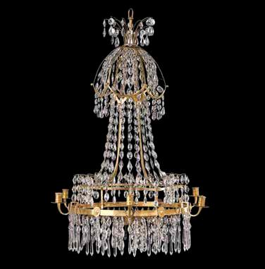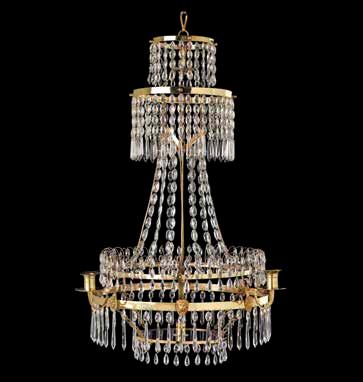 Behängd med droppar, kläppar, knappar, ovaler, piggar och stjärnor, fotplatta i carraramarmor, bas i Blybergsporfyr och Gammelklitt, monteringar av växtornamentik, lejonmaskaroner och kedjor, S–formade ljusarmar med svanhuvuden, urnformade ljuspipor, mitten med fasetterat glasspjut, kedjor, krönt av plym och klot, höjd 101, diameter 33 cm.