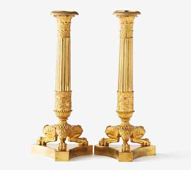 7. Ljusstakar, ett par, parisarbeten i empire, 1800–talets första kvartal, Claude Galles art, i den egyptiserande stilen, matterad och polerad brännförgylld brons.