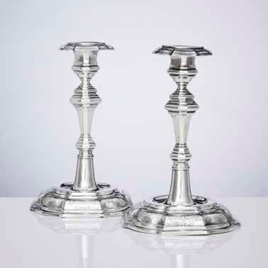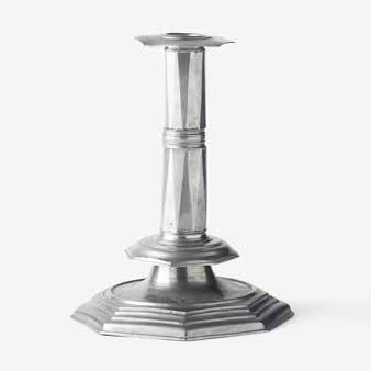 Fyrkantig fotplatta på ställ med kulfötter, slät pelare med lejonmaskaroner och kedjor, krönplatta med tofsar, rak ljuspipa med pärlstav och räfflat band, lösa manschetter, höjd 26,5 cm.