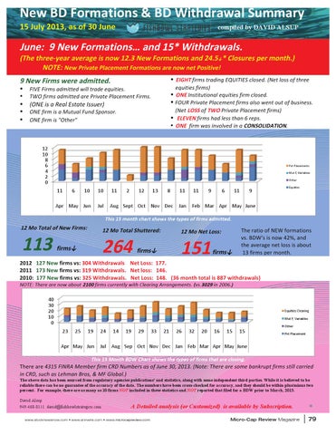 June: 9 New Formations… and 15* Withdrawals. (The three-‐year average is now 12.3 New Formations and 24.5↓* Closures per month.) NOTE: New Private Placement Formations are now net Positive! 9 New Firms were admitted. •