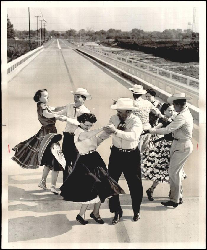 The photograph above was taken by Richard Green and was used for a story in the Oklahoma Times newspaper on July 31, 1953. Caption: “Getting in a few early twirls Friday on the new Agnew avenue bridge were four husband-wife couples of the Silver Spur square dance club.”