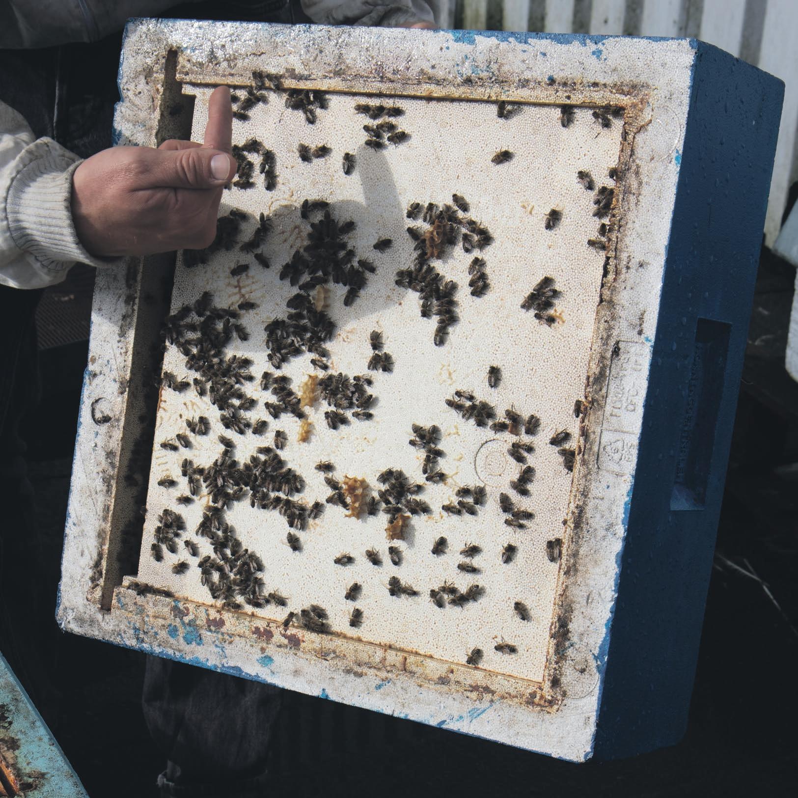 Den taktfulle birøkteren åpner forsiktig opp den ene kuben. Nå utspilles ritualet vi kom hit for å se: bienes siste nattverd. Hempel sprøyter forsiktig litt vann over dem for å hindre dem i å fy langt. Han stryker lett over dem med bare hender.