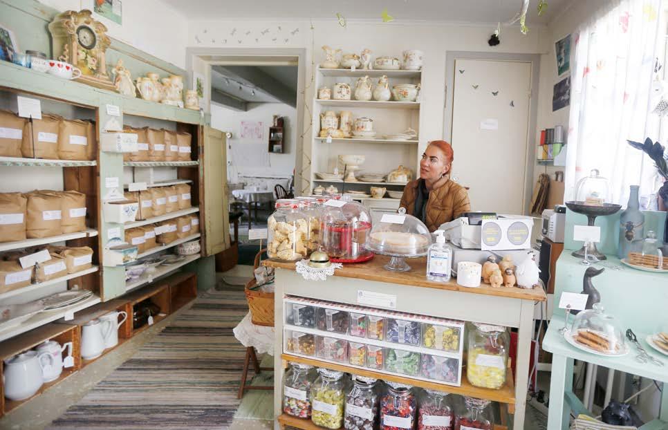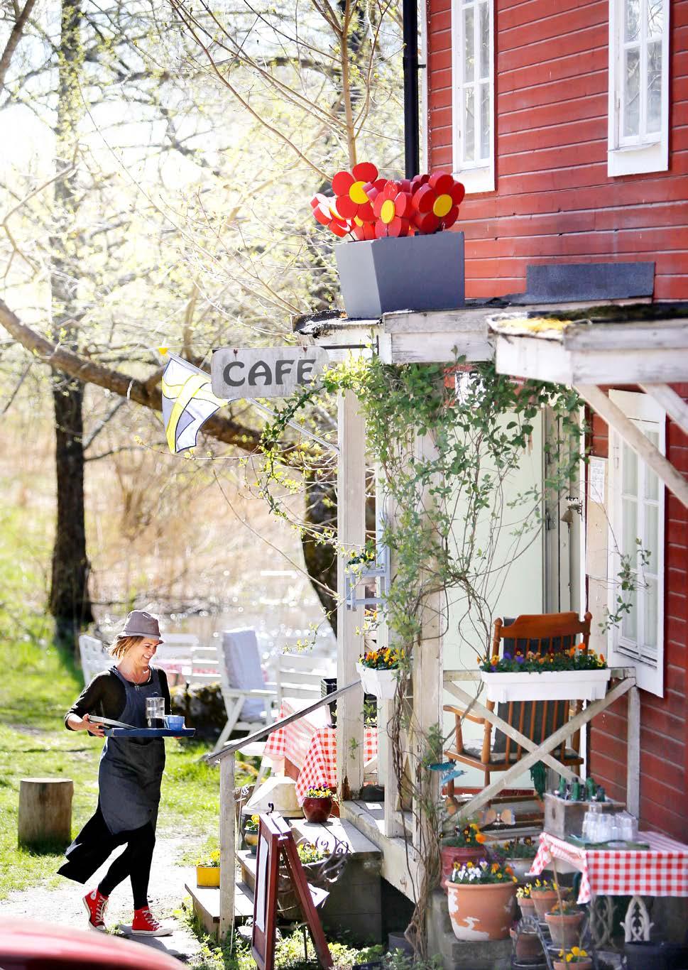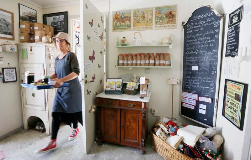 Hon följer med ett äldre par på caféet och hjälper dem med deras beställning. Innan vi lämnar Kvarnen café och antikt för den här gången smakar vi en äppelpaj, och ja, den håller högsta klass. l