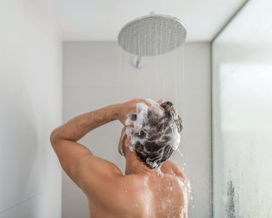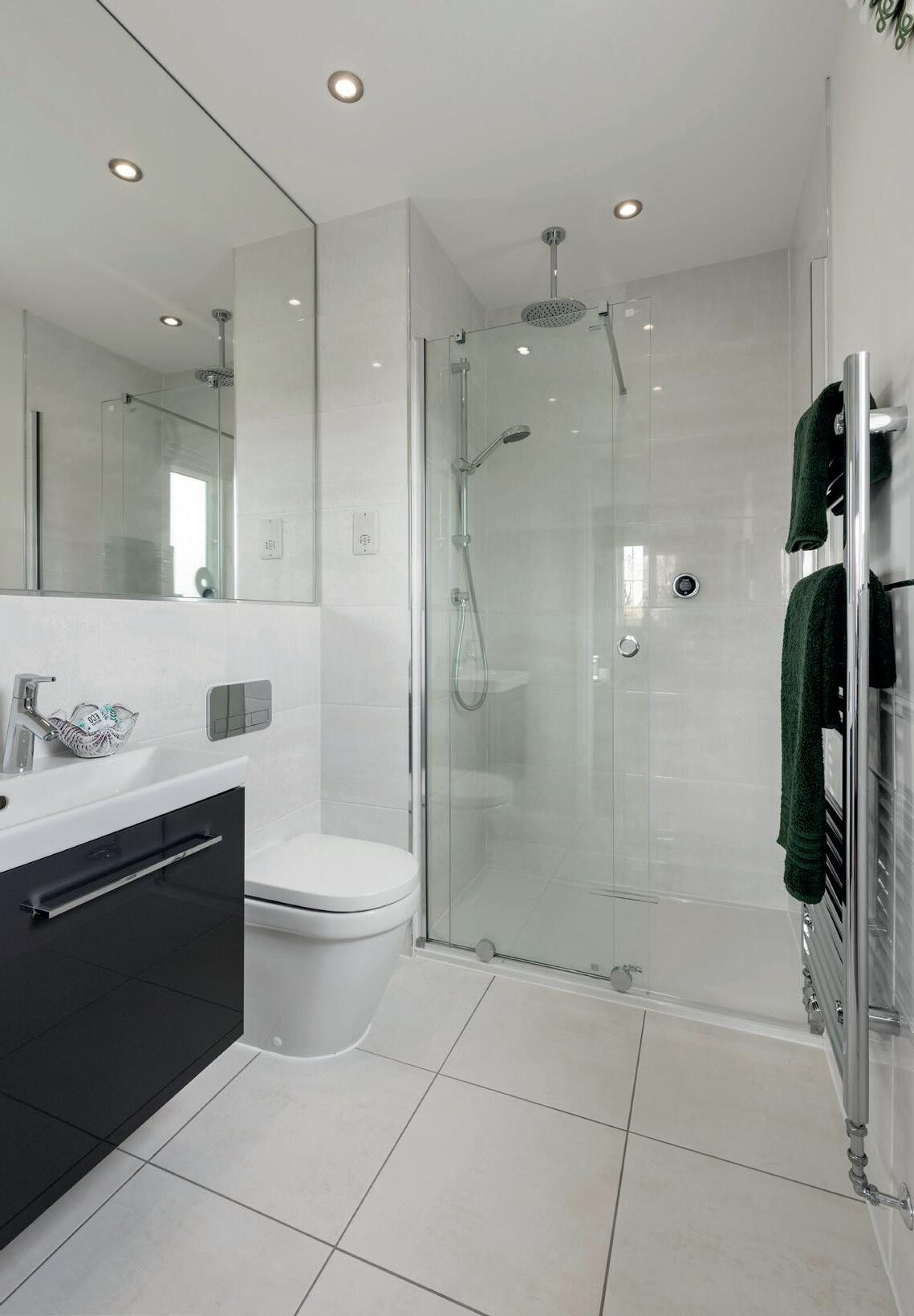 • Shower enclosure with glass sliding door (house type specific), Hansgrohe chrome thermostatic mixer, wall mounted shower riser rail and ceiling mounted drencher head
