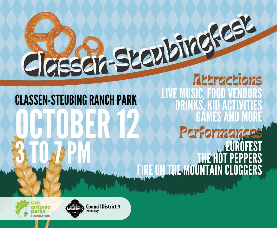 2nd Annual Classen-Steubingfest – Saturday, Oct. 12, 3-7 p.m. City Council District 9 hosts the Oktoberfest-inspired event at Stone Oak’s newest park. Classen-Steubing Ranch Park, 20240 Hardy Oak Blvd. 78258; 210-207-7325.
