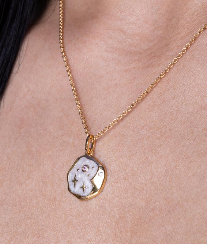 Indulge in the beauty of our Pink Opal and pearl enamel starry night gold necklace. Adorned with a picture-perfect starry night design, each detail is crafted to perfection. The necklace features a pink opal at the eye of the moon and a distant planet, complemented by a pearl-coloured enamel night sky. Be prepared to turn heads and share the captivating story behind this unique piece.