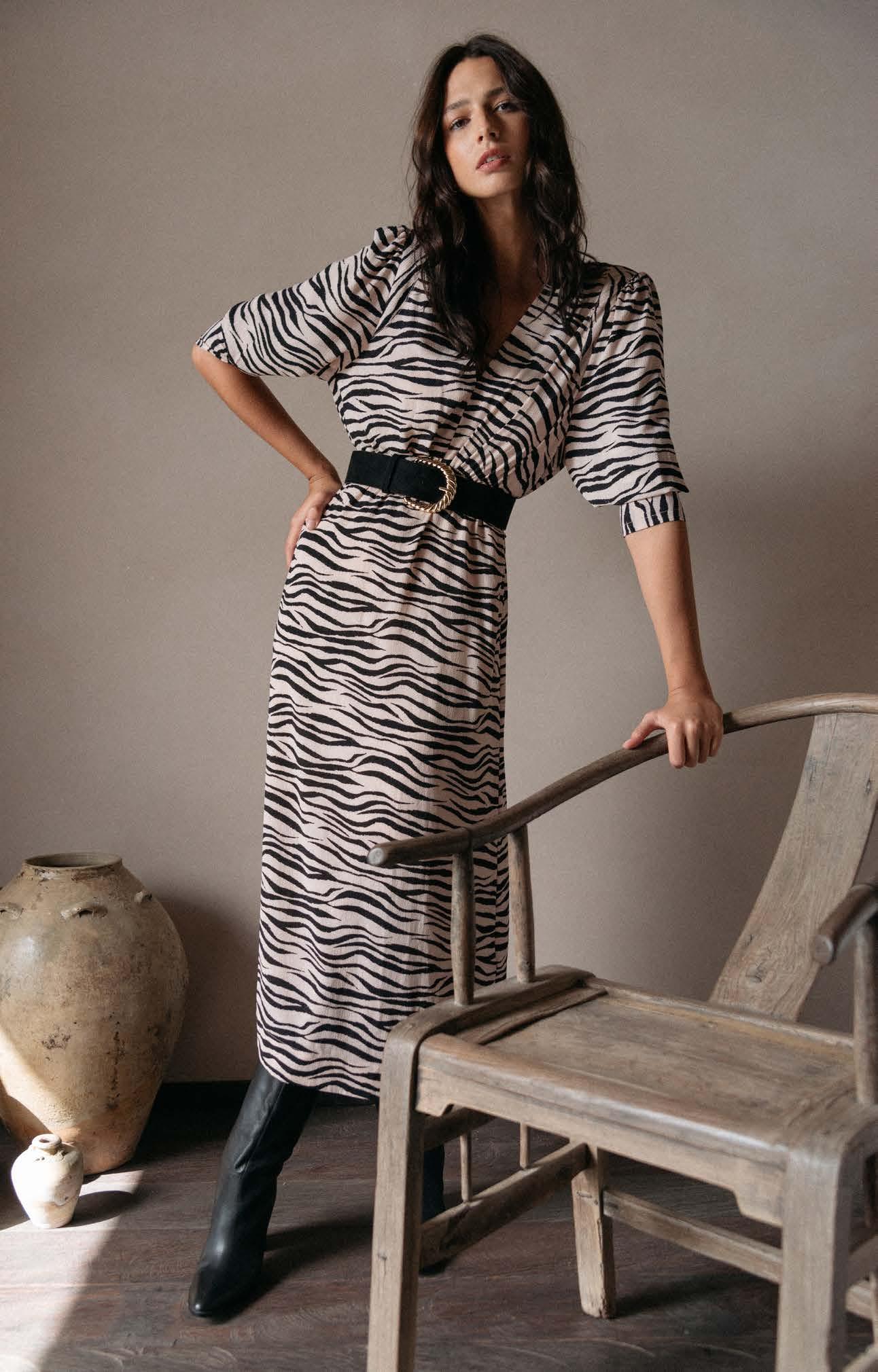 We love this goregous black and white tiger print dress, by G&M available from Ozzie & Clémentine, the perfect transitional dress for the upcoming festive season or dressed down for work. We love how they’ve styled it with a black belt to accentuate the waist, teamed with 60’s inspired knee high boots.