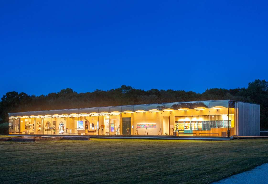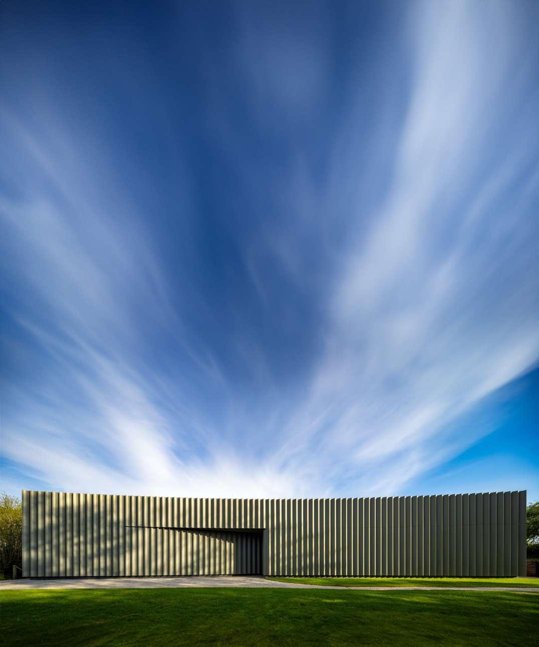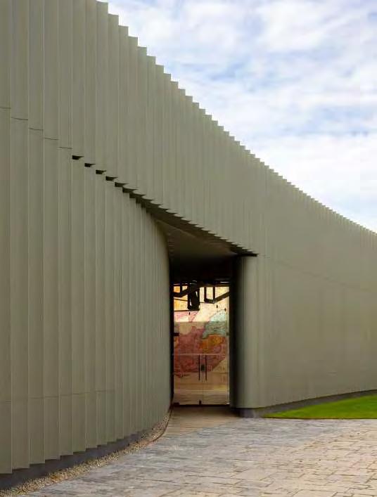 Stonewood Design wanted the museum to be a relatively unobtrusive presence on the site, and located where it would be shielded by nearby hedges. Clad in vegetation-coloured standing seam zinc with a scalloped profile at the entrance, the building is enigmatic – even the sole entrance window is recessed and barely visible.