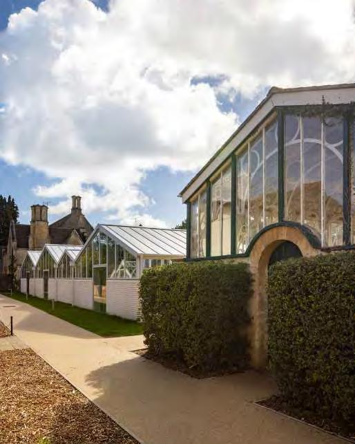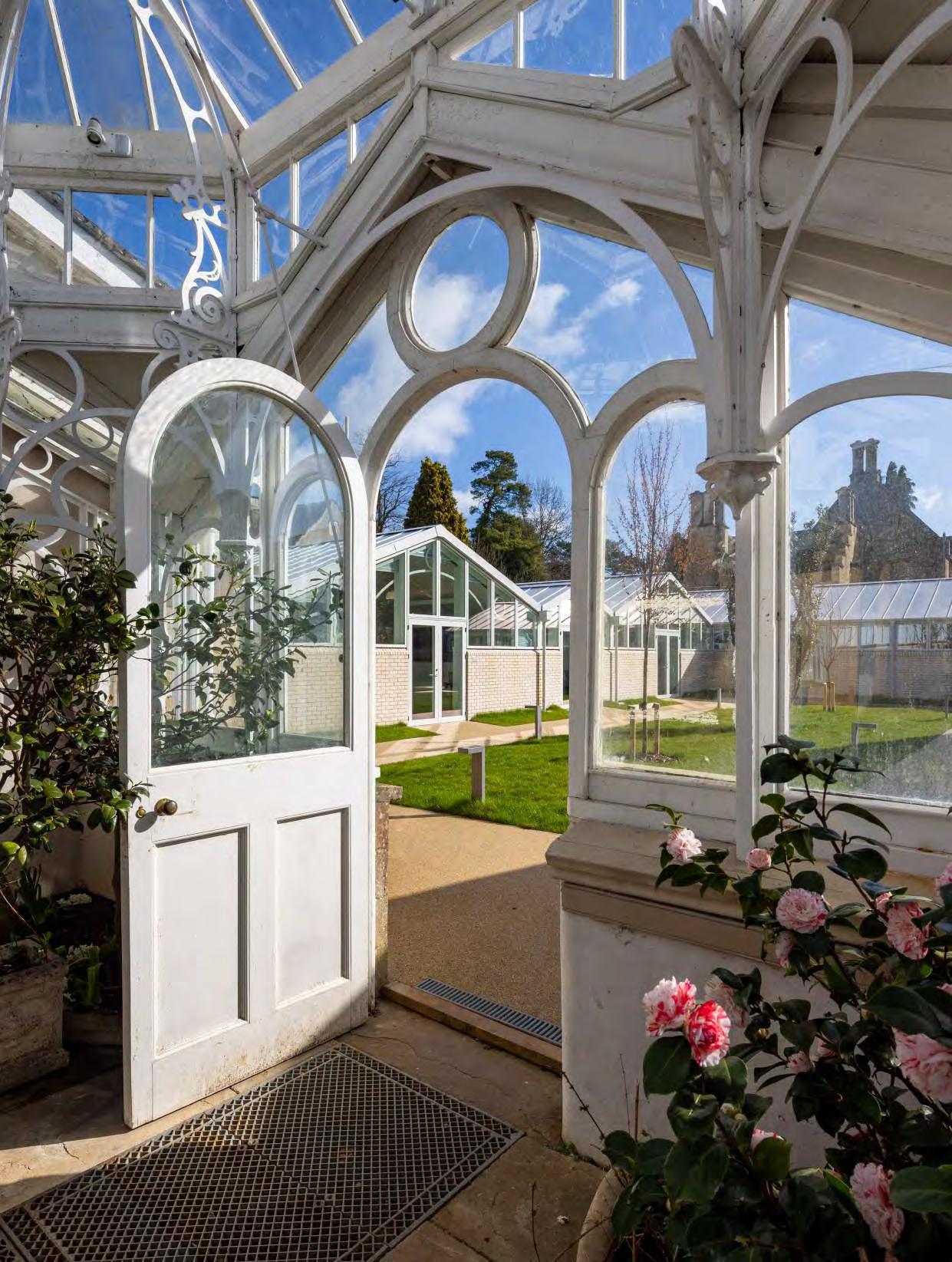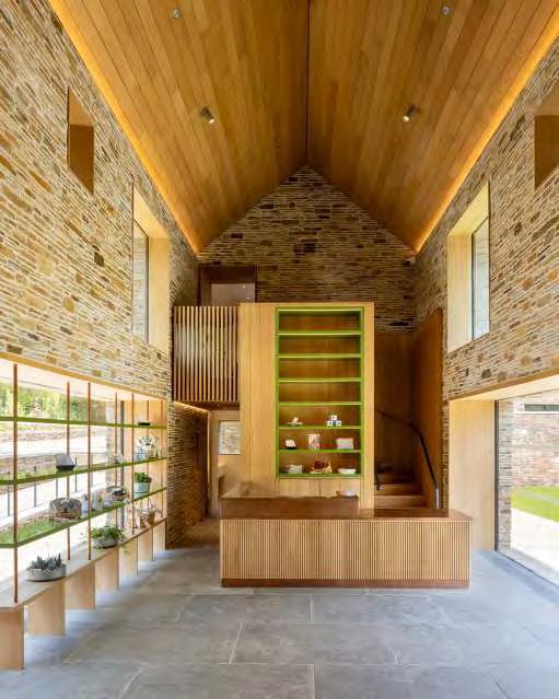 Visitors wanting to explore South African hospitality can head to the café. This overlooks a productive garden and is configured from new build elements topped respectively with Cornish Delabole slate and zinc roofing. The garden walls are conceptually continued into the café as stone walling, and are part of an interior palette featuring more yellowwood joinery and blue lias flooring. But the showstopping feature is the façade facing the garden, which is a single piece of glass at 20 x3m. This gives north-facing views of the productive garden and a glasshouse, manufactured to a traditional Victorian design.