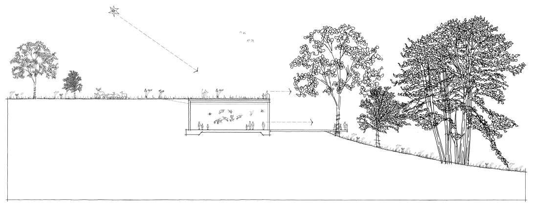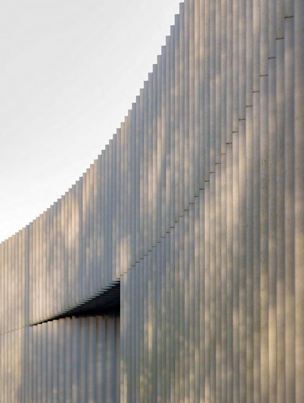 As the walkway winds its way through the tree canopy, the visitor catches the first glimpses of the museum’s glazed façade between the trees and foliage. It is an unexpected and almost incongruous sight to find such an elegant civic space hidden away in this remote bucolic setting.