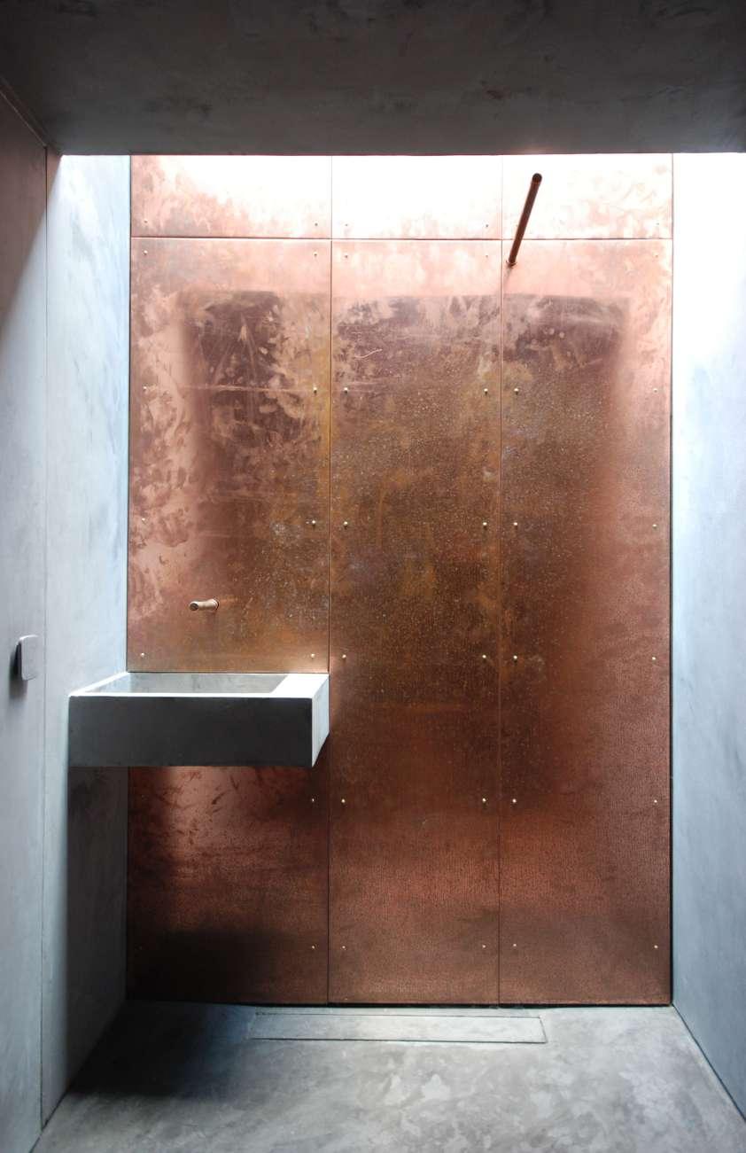 Internally soft, crafted materials line the surfaces, as elements of furniture. An oak lined storage wall incorporates a sofa bed, a wood burner, and cupboards. Behind the oak wall a wet-room is lined in copper, and incorporates bespoke concrete sanitaryware.