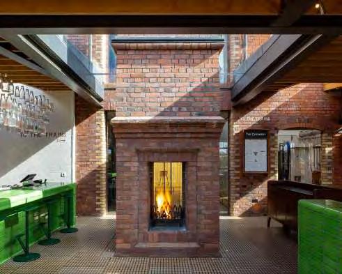 Stonewood Design’s aim was to retain and restore as much of the original structure as possible, but with some decisive interventions. A double-height void was cut in the ground floor to enable views down into the lower ground floor cheese-making area from a glass viewing bridge. The much-altered front of the building facing the station was rebuilt with the introduction of a large glass window, a nod to the semi-open, lean-to of the creamery’s original façade. The building’s landmark chimney was found to be structurally unstable, and had to be taken down brick-by-brick and rebuilt with a more stable internal structure. Meanwhile on the lower level, the rear projection housing the café was given a new roof and floor, and now opens onto a landscaped garden.