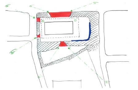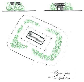The enclosure made by the vegetation opens strategically to allows view of the facade, and to mark the entries.