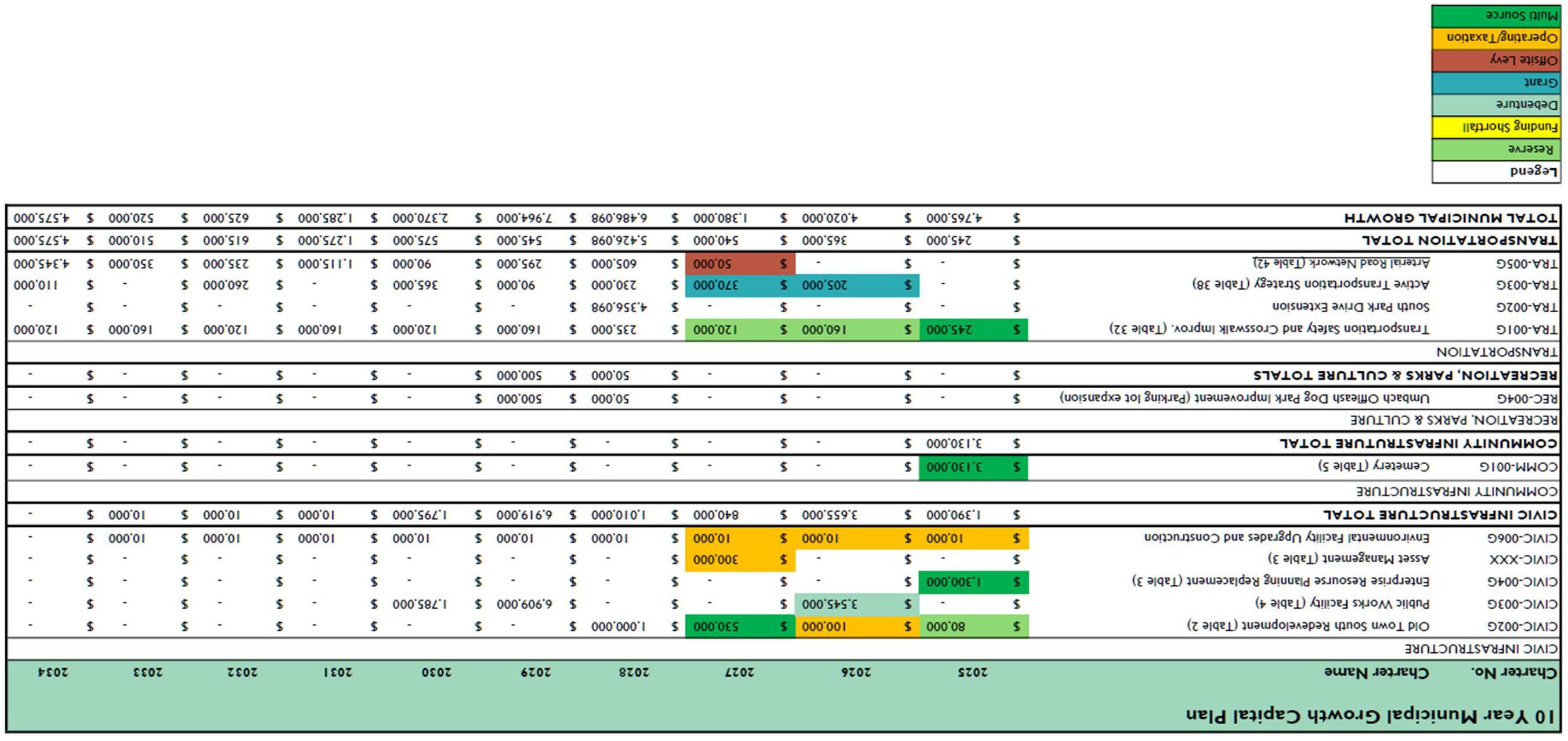 Transportation (roads, sidewalks, and trails) are funded through grants and minimally through reserves. New projects may be funded through grants, debt, or offsite levies (if criteria are met). The Town will need to monitor the grants provided from the Provincial and Federal governments and work towards making these programs more sustainable by funding regular reserve contributions from the tax base.