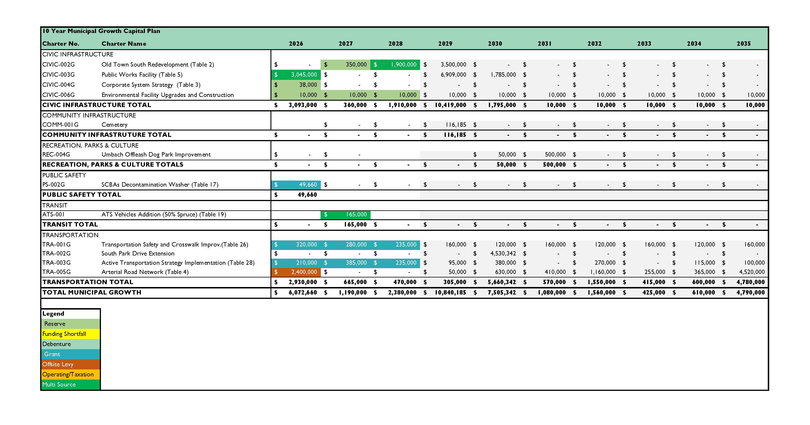 The ten-year Long Term Capital Plan shows a current projection of $166 million in capital requirements. Projects past the first three years of the plan are identified at a high level based on municipal need without consideration of designating funding sources. As these projects are prioritized and move closer to the three-year Corporate Plan, the costs are refined, and funding methods are proposed for Council’s consideration.