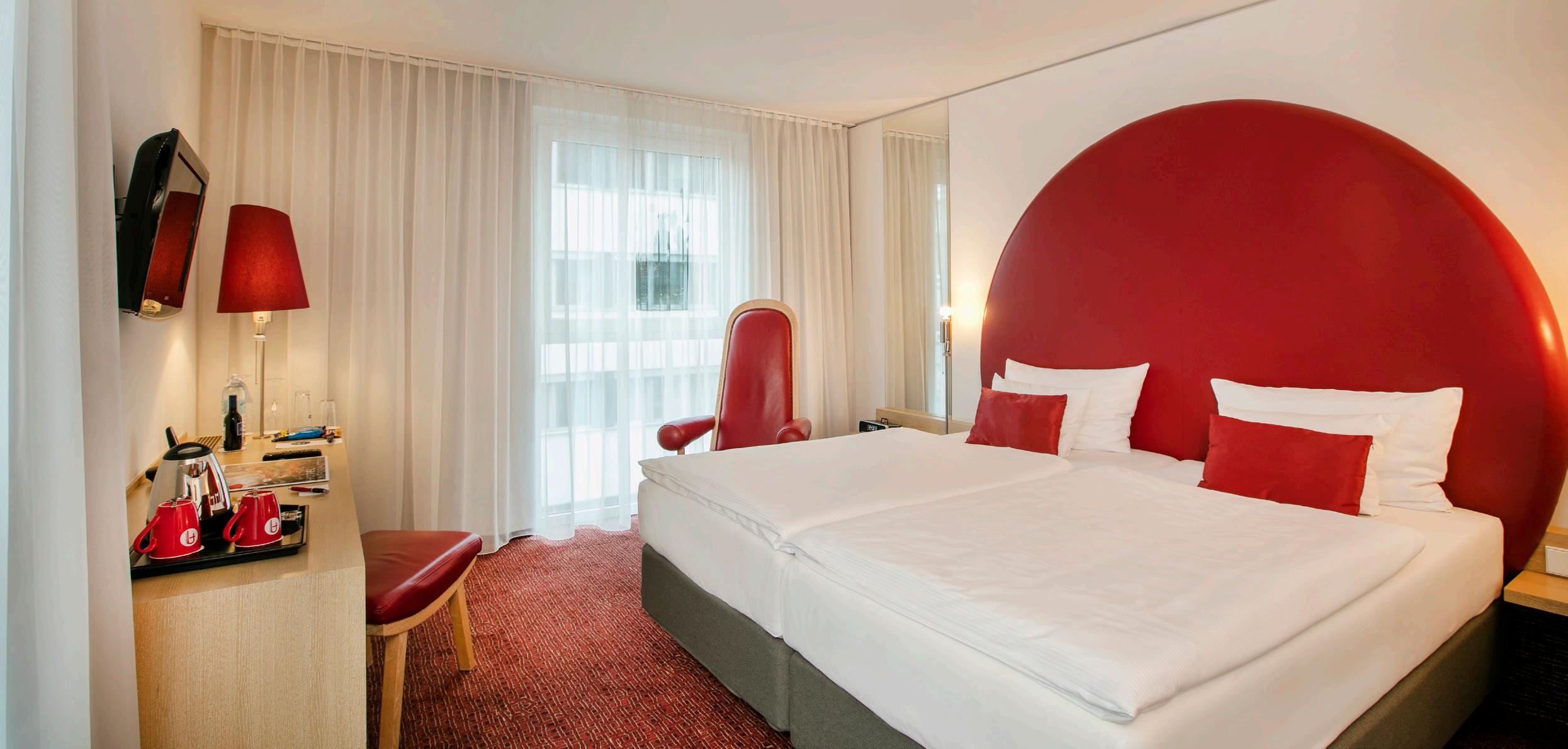 Sonnenstrahlen schimmern durch die Gardinen. Das Kopfteil in Rot erinnert an die aufgehende Sonne Hamburgs. Besondere Annehmlichkeiten: der extra-lange Schreibtisch und Free-WLAN.