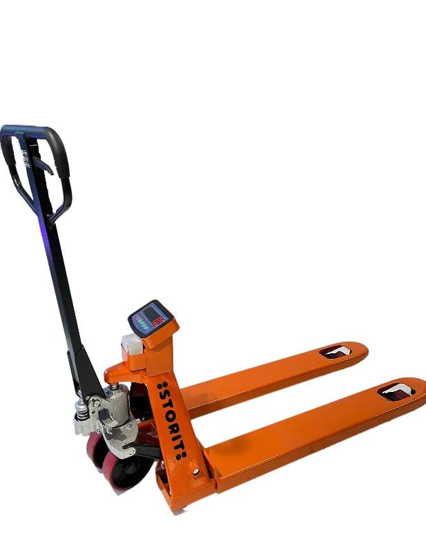 "Scale Hand-Pallet truck for weighing- and moving pallets. Integrated pump. Possibility to lower the forks as well pressing the lowering pedal with your foot.