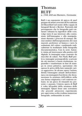 n. 1958, Zell am Harmers., Germania Ruff è un esponente di spicco di quel gruppo di artisti cresciuti all’Accademia di Düsseldorf nel nome della coppia di fotografi Bernd e Becher. Partendo dal presupposto che la fotografia può catturare soltanto la superficie delle cose, volge tutto il suo interesse alla costruzione dell’immagine e alla manipolazione durante i processi di stampa. Distaccandosi dall’insegnamento dei suoi maestri, preferisce al bianco e nero la seduzione del colore, cambiando radicalmente la tradizione della fotografia documentaristica. Con la serie Astratti, inizia ad interessarsi alla poetica del digitale; le immagini sono costruite da macchie di colore. Nei Nudi, Ruff preleva immagini pornografiche scaricate da siti internet a bassa risoluzione, ingrandite e trasformate in fase di stampa in senso pittorico, operazione che spesso le priva della loro naturale carica aggressiva. In alcune opere l’artista, ibrida l’immagine attuale dell’architettura con immagini d’archivio che documentano la struttura dell’edificio nella sua forma originaria e nel contesto urbano, in un gioco di rimandi tra presente e passato. L’intera opera di Ruff è volta all’analisi della struttura delle immagini. Quasi fosse uno scienziato che procede attraverso esperimenti, per ogni tema scelto realizza numerose fotografie, ordinandole in serie.