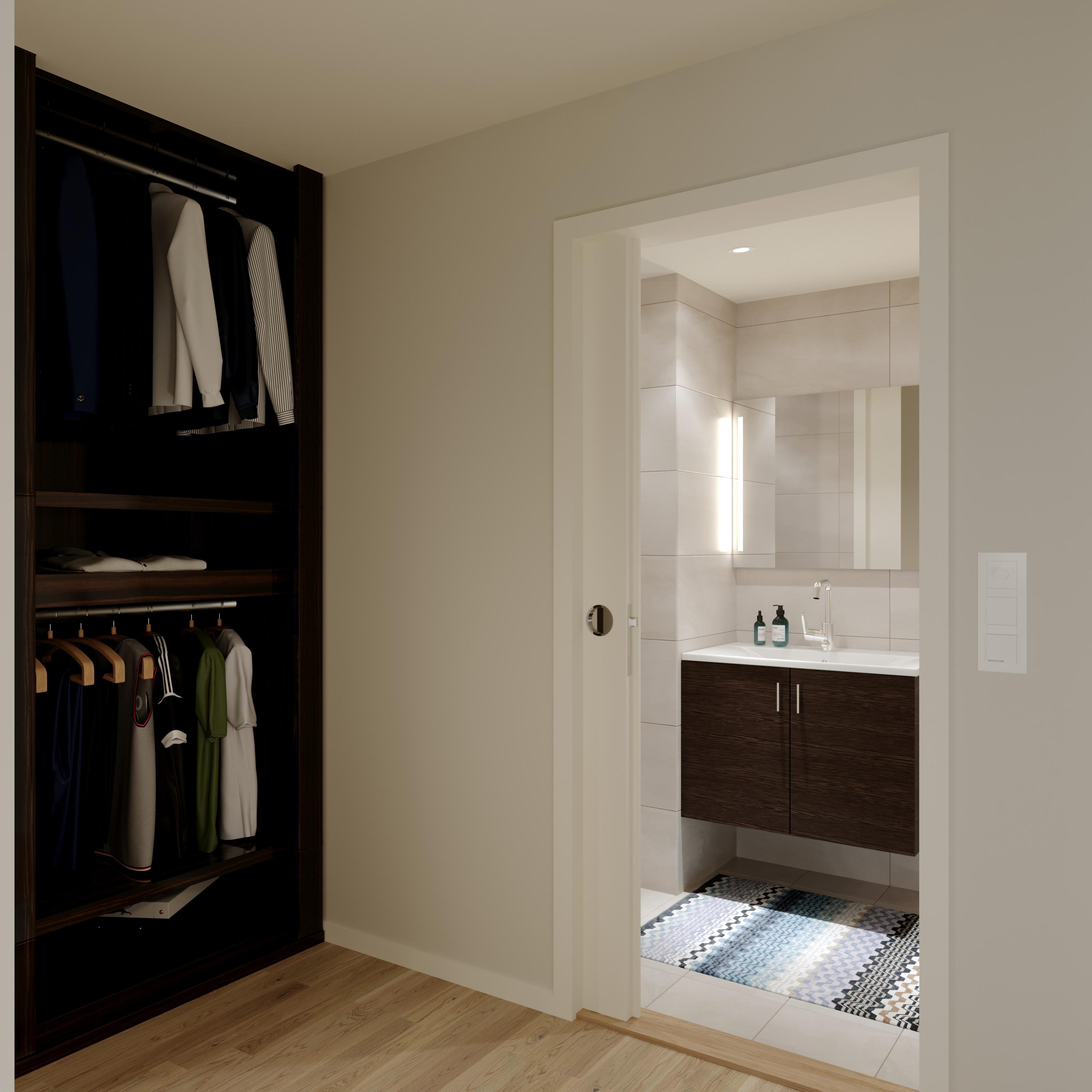Alle illustrasjoner, 3D bilder, 3D animasjoner, skisser, ”møblerte” plantegninger m.m. er kun ment å danne et inntrykk av hvordan den ferdige bebyggelsen og utomhusarealet kan bli, og kan ikke anses som endelig leveranse. Inntegnet utstyr/inventar/hvitevarer med mer medfølger ikke dersom det ikke er beskrevet i leveransebeskrivelsen/ matrisen, og det kan derfor forekomme elementer i presentasjonsmaterialet