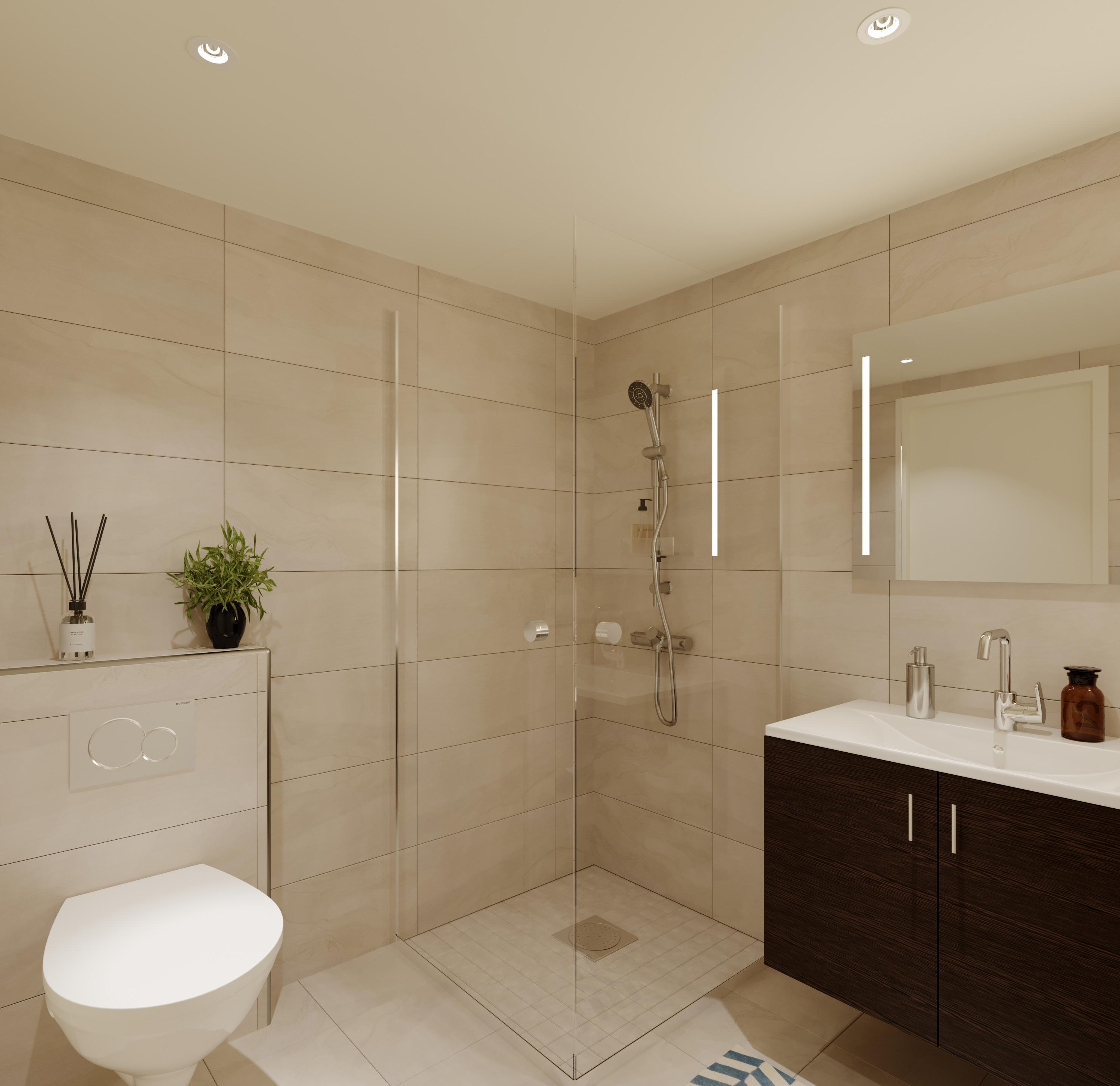 Baderomsinnredning fra Sigdal type Bark 60 cm eller 80 cm (Utifra avsatt plass på tegning.), samt heldekkende servant i kunstmarmor med ett vannuttak. Speil med innebygget lys. 1 stk. ettgreps servantbatteri Oras Saga 3907F. Dusjdører i glass med krom hengsler og håndtak. Dusjbatteri Oras Oramix. Dusjgarnityr Oras Optima 2790. Vegghengt toalett Porsgrund Seven D med soft close sete samt forkrommet blank spyleknapp. Sluk. Størrelse dusjdører tilpasses størrelsen på bad.