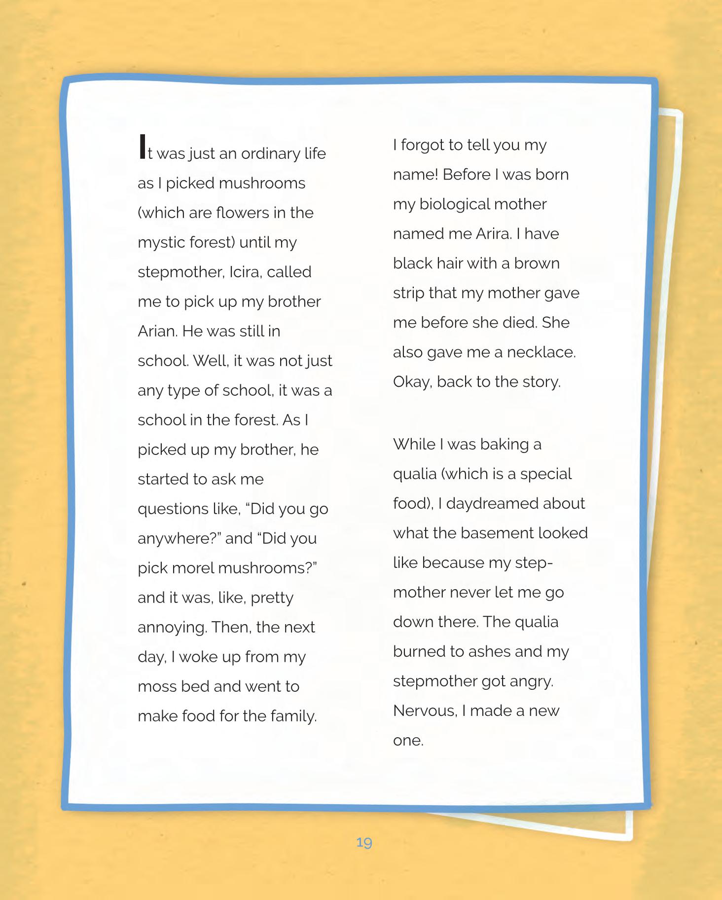 It was just an ordinary life as I picked mushrooms (which are flowers in the mystic forest) until my stepmother, Icira, called me to pick up my brother Arian. He was still in school. Well, it was not just any type of school, it was a school in the forest. As I picked up my brother, he started to ask me questions like, “Did you go anywhere?” and “Did you pick morel mushrooms?” and it was, like, pretty annoying. Then, the next day, I woke up from my