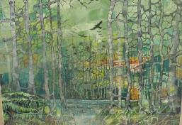 In 2010 he was inspired by a visit to a small wood with a pond near Clifton Three paintings on the theme o f woodland, water and birds were the result o f this and "Cro w's Nest " is one o f them