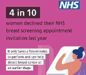 If you have previously been invited bu t missed the oppor tunity to have your breast screening, or you are o ver 71 and would like to continue to be screened, appointments are available by calling 01582 497599