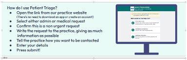 If a patient is vulnerable, or has learning diff iculties or canno t access the form via the website or smar t phone, they can still call and the reception staff have all been trained to f ill ou t the form on their behalf Walk in patients will be asked to f ill ou t the form, then they will need to wait for a response f rom the clinician, the reception staff will no t be able to book appointments for GP appointments or minor illness this will all be done by the triage clinician once the form has been submitted