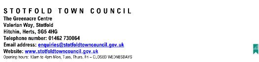If you are interested in applying, you can contact the To wn Council o ff ice on 01462 730064 or email them at enquiries@sto tfoldto wncouncil.go v.uk to request more information and an application pack. Additionally, you can do wnload the application pack f rom their website at http://www.sto tfoldto wncouncil.go v.uk/Useful Documents 22464.aspx (Useful Documents page).