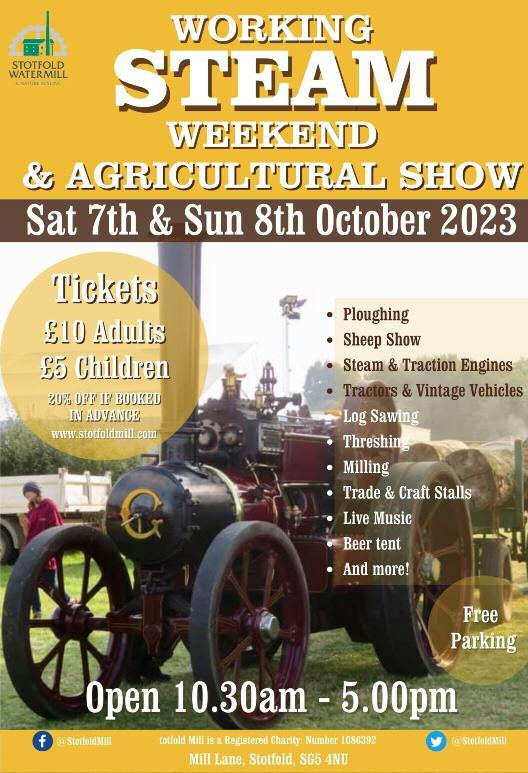 The Mill is run entirely by volunteers, f rom the lo vely ladies in the tea shop to the exper t stewards who tell the Mill’s stories to our visitors If you can spare an hour or two a month to help ou t, we’d lo ve to hear f rom you Maybe you’d like to get involved behind the scenes? We’re always looking for super people to join our management teams (marketing, volunteer suppor t, events) or even as a trustee Whatever your skills, experience or areas o f interest, we can pu t you to work, and volunteering with us is a great way to learn new skills and make new f riends. Pop us an email (enquiries@sto tfoldmill.com) and we’ll get in touch. Bu t time’s a - ticking, and we’re working flat-ou t to wards our au tumn event – the Working Steam Weekend! If you haven’t come to the WSW before, you’re in for a treat. The Mill f ield is full o f working steam machiner y, f rom the thrashing arms o f the threshing machine to the giant belts o f the timber