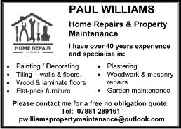 Lo wer Wilbur y Farm 07988 771107 Maintenance Ser vices - SHMS 01462 887366 Mo w & Weedit Garden Ser vices 07765 495200 New Kitchens 01462 812826 Nick Sayer Plumbing & Heating 07456 559756 Nicky’s Nails 07747 042239 Nor th Her ts Road Runners 01462 639215 Oven Clean & Repair Ser vices 07878 444559 Painter/Decorator - Paul A Robinson 07761 751634 01462 232642 Paul Adler Opticians 01462 732393 Paul Eley Tiling 07818 000508 Paul Thomas Landscaping 07889 811065 Paul Williams Home Repairs & Maintenance 07881 289161 Piano Lessons - Christine Walker 01462 731357 Piano Lessons - Elmitt Piano Academy 07449 461465 Pilates - Zanna Newton 07719 862371 Pet Grooming - Paws & Claws 07913 005268 Plumbing - ALM Plumbing 07950 311963 Plumbing - C Plumb 01462 700862 Plumbing & Heating - GSP Heating & Plumbing 01462 615922 Plumbing - J D Heating & Plumbing Ser vices LTD 07474 444288 Plum-tek 01462 618058 Ray The Carpenter 07885 020895 RH Gardens 01462 612033 Roecro ft Centre - Maureen Winters 07727 688877 Regency Flo wers 01462 732616 Sto tfold & Arlesey Ro yal British Legion 01462 734133 Satchells Estate Agents 01462 733730 Saunders Garage 01462 730222 Sheldon Electricals 01767 448188 Shel's Shabby Chic, V intage painted furniture & workshops 01462 234228 Slimming World 07515 557803 Solicitors - HR J Foreman Laws 01462 458711 St Mar y's Church Hall 07727 688877 Sto tfold Ar t Group 07734 304590 Sto tfold Bo wls Club 07739 760719 Sto tfold Conser vative Club 01462 730534 Sto tfold Foo tball Club 01462 539297 Sto tfold Gardening Club 01462 834854 Sto tfold Good Neighbour Group 07599 925587 Sto tfold Junior Foo tball Club 07706 951263 Sto tfold Judo Club 07872 594499 Sto tfold Twirlers 07732 505614 Sto tfold Mill 01462 734541 Sto tfold News Magazine 01462 731986 Sto tfold Pharmacy 01462 730249 Sto tfold Shor t Mat Bo wls Club 01462 730841 Tailoring Ser vice 07575 417217 The Cleaning Hub 07990 297297 Warrens Windo ws 01462 261401 Wate Remo val (Josas Waste) 07739 488472 Windo ws - Repairs & Installations (J Garside) 07951 473505 Windo w Cleaning - ACCS Ltd 01462 629302 Windo w Cleaning (Jacks) 07950 510589 Yoga - Freda Dodswor th 01767 627611 Accountancy & TaxSue Matejtschuk (SCM Accountancy) 01462 624926 AD Garden Rooms 01438 313765 A JB Fencing 07837 791365 A J Day Builders 01767 314445 Alf ie’s Barbers 01462 658449 Andy Leonard Painter & Decorator 07889 903283 Arlesey Walking Group 01462 638286 Arlesey Pharmacy 01462 731200 Arlesey Social Club 01462 731361 Aquarius Garden Design 01462 731292 Ashwell So ftware / Sigma Off ice 01462 742783 Barn Hair Studio 01462 835611 Bal & Co Mo tor Care 01462 731500 Bews Electrical 01462 834488 Big Minibus Hire 07817 766997 BK Electrical / Brian Kelly 07817545314 Box Of Cakes Cafe & Cake Shop 07812 055587 Britannia Coaches 01462 436125 Broadband Communications 01462 732628 BSH Glazing ( Windo ws & Doors) 01462 730884 Bugs ‘n’ Things Pest Control 0800 026 8823 Builders - SJ Brock 01462 231257 Carpet Cleaning - ACCS Ltd 01462 629302 Carpets & Flooring - Letchwor th Carpet Centre 01462 481312 Carpets & Flooring - Paul Faulkner 01462 731674 Catsitter - Claire 07984 344997 Centroheat Domestic Boiler & Heating Ser vices 07885 415363 Compu ter Repairs - NIck Saunders 07521 279960 The Cooker Buddy Oven Cleaning 01462 810065 Chris Webster, Sto tfold 01462 834108 (Correspondent for The Comet ) Darren Peters Proper ty Maintenance 01462 733322 Dennison’s - House & Garden Clearance 07522 354141 Dog walking & cat sitting - Smiley Pets 07894 561765 EH Crouch Funeral Directors 01462 834040 Electrician - Terr y C Seymour 01462 236559 Fair f ield Bo wls Club 07811 738599 Fencing (A JB) 07837 791365 Finesse Interiors 01462 896046 First Step Estate Agents 01462 659730 Foo t Health Pro fessional - V icki Eagles 07812 399659 Foo t Pro Podiatr y 07377 536685 The Garden Robin Limited 01462 815968 Gifford Dance Academy 07585 221513 Graham Smith Brickwork & Paving 07703 171857 Greenacre Transfers Airpor ts & Chau ffeur Ser vices www.greenacretransfers.co.uk 07555 707848 Guides - Sto tfold Guide Association 01462 235273 Henlo w Vets 01462 416416 Hypno therapy - Pathway Hypno therapy Rooms 07497157531 Impact Shu tters and Blinds 01462 816429 James’s Carpentr y & Handyman Ser vice 01462 234292 Jar vis Foo tcare 07816 329363 Kumari Chiropractic 07479 945995 Locksmith Ser vices 01462 290226 Lo ved Gardens 07981 275663