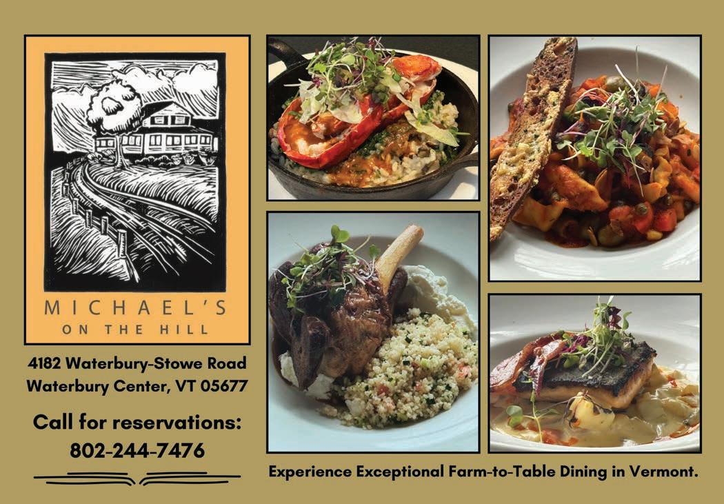 Patio dining, fresh seafood, hand-cut steaks. Takeout. Reservation recommended at thewhip.com or (802) 253-6554. 18 Main serves a full breakfast featuring homemade baked items daily, 7-11 a.m., (802) 253-7301. At the Green Mountain Inn, Stowe village.
