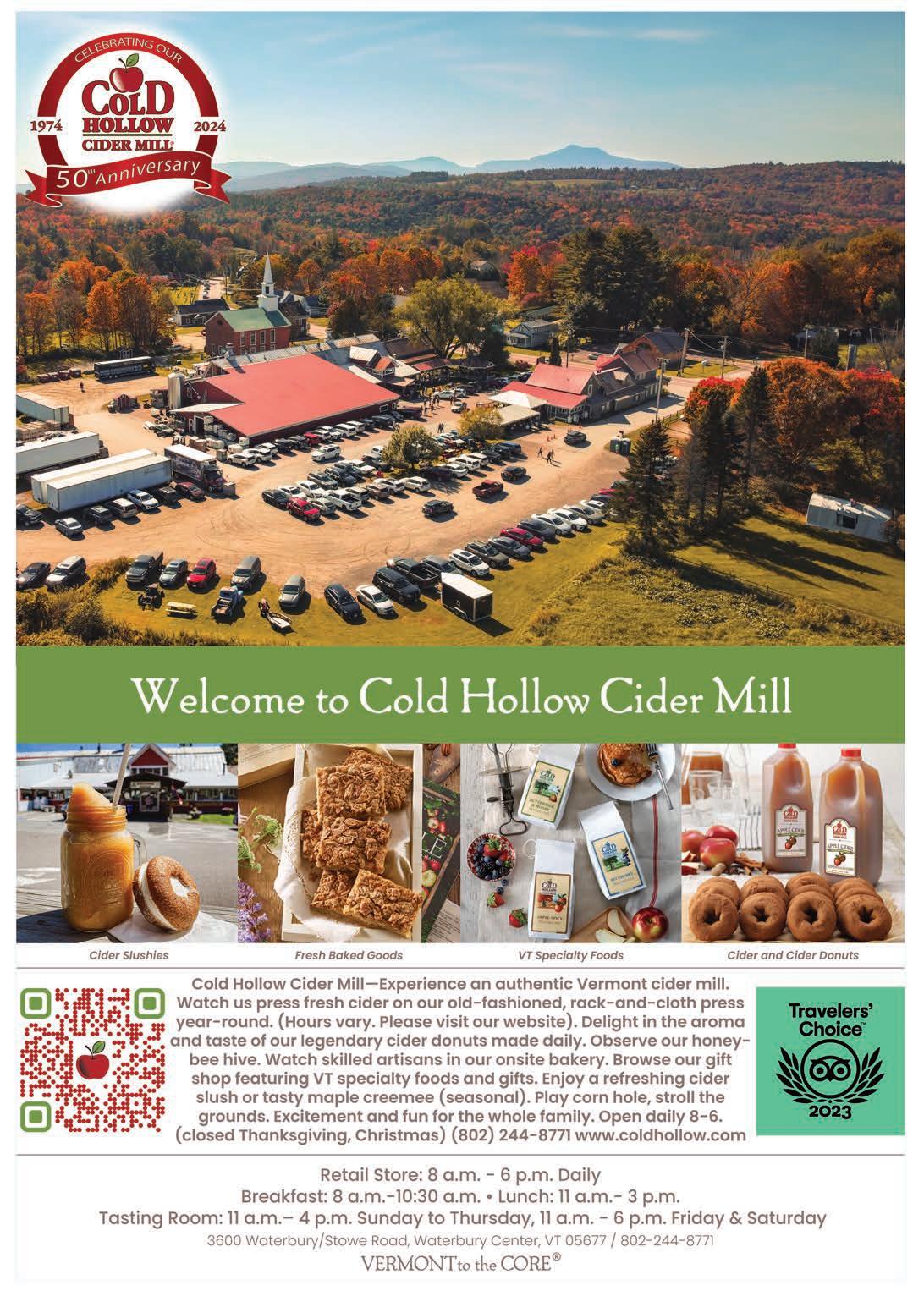 Experience Vermont. Independent, authentic, and charming. Uncover your inner Vermonter with family or friends. Visit our working cider mill, Route 100, Waterbury Center. (802) 244-8771, coldhollow.com.