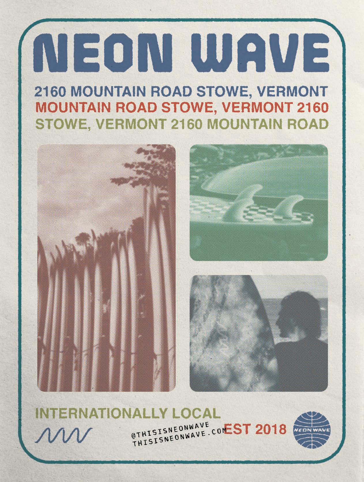 Snowboarder and surfer owned and operated. Specializing in hard and soft goods to support you through all four seasons. We look forward to moving forward. 2160 Mountain Road, Stowe. thisisneonwave.com, @thisisneonwave.