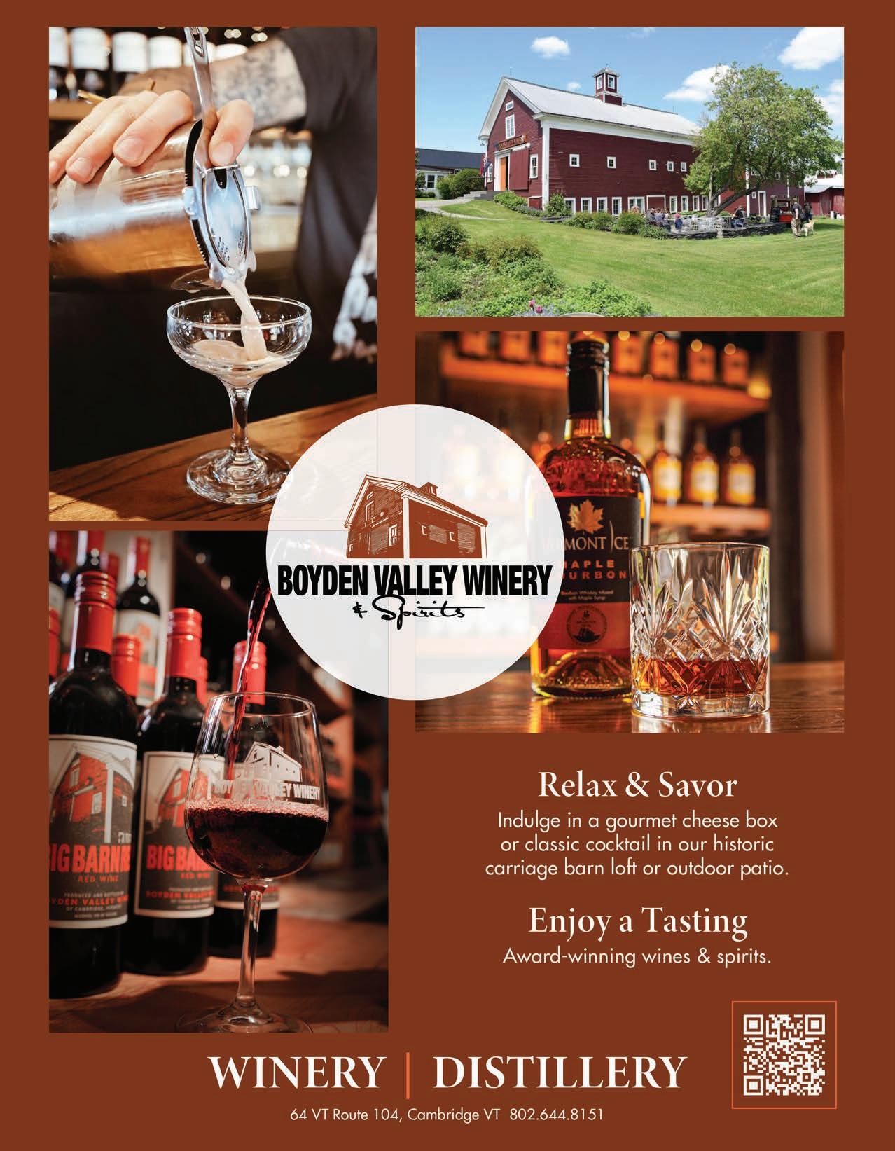 Just seven miles from Smugglers Notch scenic byway. Stop in and sample our award-winning wines and spirits in our restored carriage barn. Tasting room. Expanded summer hours. 64 Vermont 104, Cambridge. boydenvalley.com, (802) 644-8151.