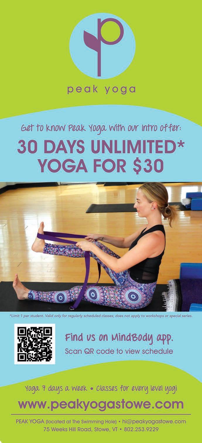 Practice yoga in a beautiful space with natural light and high ceilings. Beginner friendly, weekly schedule online. Specials: Stowe sound immersion, chakra art, prenatal, chair yoga, meditation. Privates available. Kate Graves, 515 Moscow Road. kgravesmt@gmail.com, (802) 253-8427, stoweyoga.com.