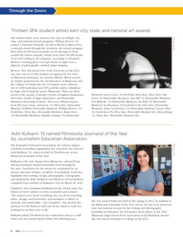 Brower, who will attend New York University in fall 2013, was also one of 13 SPA students recognized by the 201213 Minnesota Scholastic Art Awards (MSAA). MSAA awards are jointly sponsored by the Art Educators of Minnesota and the College of Visual Arts; the 13 winners were selected out of 1,900 individual and 165 portfolio entries submitted by high school students across Minnesota. There are three levels to the awards: Gold Key (words of highest distinction); Silver Key (works of high distinction); and Honorable Mentions (deserving of merit). This year’s MSAA winners from SPA were Claire Anderson ’13 (Silver Key, Honorable Mention, Portfolio Honorable Mention); William Brower ’13 (Gold Key, Silver Key, Honorable Mention); Katya Deve ’13 (Honorable Mention); Maddie Graham ’13 (Honorable