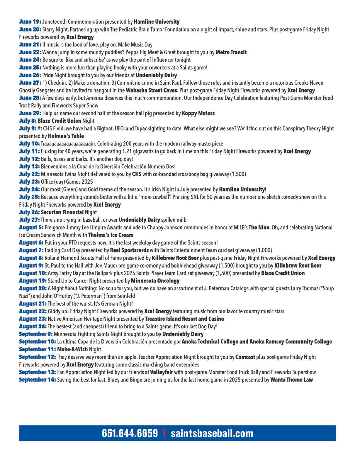 In conjunction with Major League Baseball’s broadcast deal with Sinclair Broadcast Group for Minor League Baseball, the St. Paul Saints will once again return to the CW Network in 2025, with more than one-third of the home games on the station. A total of 26 of the Saints 75 home games can be seen on the CW Network in 2024. The Saints will also expand their reach around the state in 2025 working with Gray Media. In addition, all 150 games can be heard, once again, on KFAN Plus, 96.7 FM.