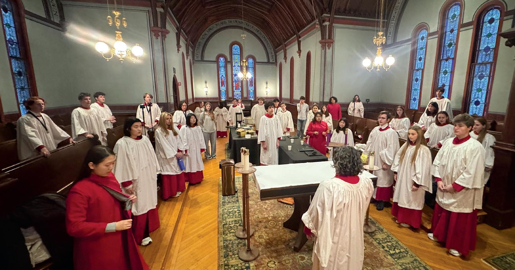 The choir members rehearse two evenings and one morning each week, and most are not studying music for academic credit. This provides an opportunity for some respite from the rigors of the academic day, and often a challenging athletic schedule. The choir works hard, and the rewards of singing together with friends in our beautiful chapel are energizing and significant to the life of the school. Recent highlights for the choir have been concert tours to English cathedrals, collaborations with the Ballet Company on White’s “The Fire & The Rose” and “Songs of Innocence,” the Annual Festival of Lessons & Carols, Thursday night Compline, frequent recordings and livestreams, and the rich variety of services that take place throughout the school year. The opportunity often arises to welcome visiting choirs from across the world, and the choir is fortunate to work with them both in a concert and workshop setting. Recent ensembles have included Stile Antico (Oxford), Heinevankar (Estonia), Quink (Holland), Clare College Choir (Cambridge), Cathedra (Washington DC), Thomaskirche Choir (Leipzig), as well as the inspiring guest artists you hear tonight.