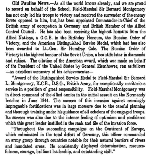 On the 80th Anniversary of VE Day Atrium clicked on the July 1945 magazine. The praise heaped on FieldMarshal Sir Bernard Montgomery at the start of the Old Pauline News section immediately caught the eye.