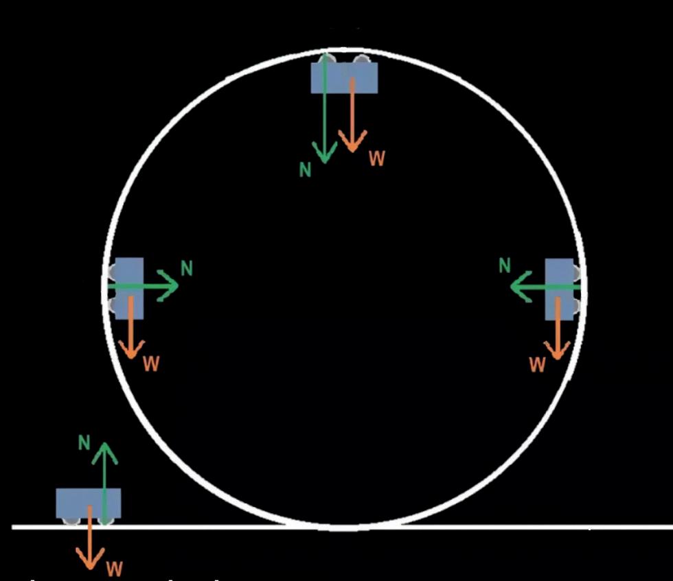 this stage, the normal contact force acts entirely as the centripetal force, and for the centripetal force to have a constant magnitude, normal contact force must be at its greatest here But what about when the carriage is at the top?Here both weight and normal contact force act downwards,and we know that thecentripetal force must also act downwards, towards the centre of the loop. At thispoint,both weight and normal contact force act as the centripetal force, and the normal contact force is at its minimum so that the magnitude of centripetal force remainsconstant,or zero