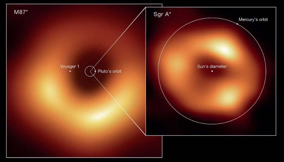 On May 12th 2022, a team of astronomers operating the Event Horizon Telescope released an image of the black hole at the centre of the Milky way, named Sagittarius A* (Sgr A*). The black hole M87 previously imaged at thecentreof thegalaxy,shown on the left of the image, is 2,000 times bigger than Sgr A*, but is also 2,000 times further away from Earth, allowing for a similar resolution in both images. The reason this image is such a big deal is that M87* was an unusually large black hole,whereas Sgr A* is much smaller and similar to the many black holes at the centre of other galaxies, meaning we have a much greater idea as to what theseother black holeslook like.