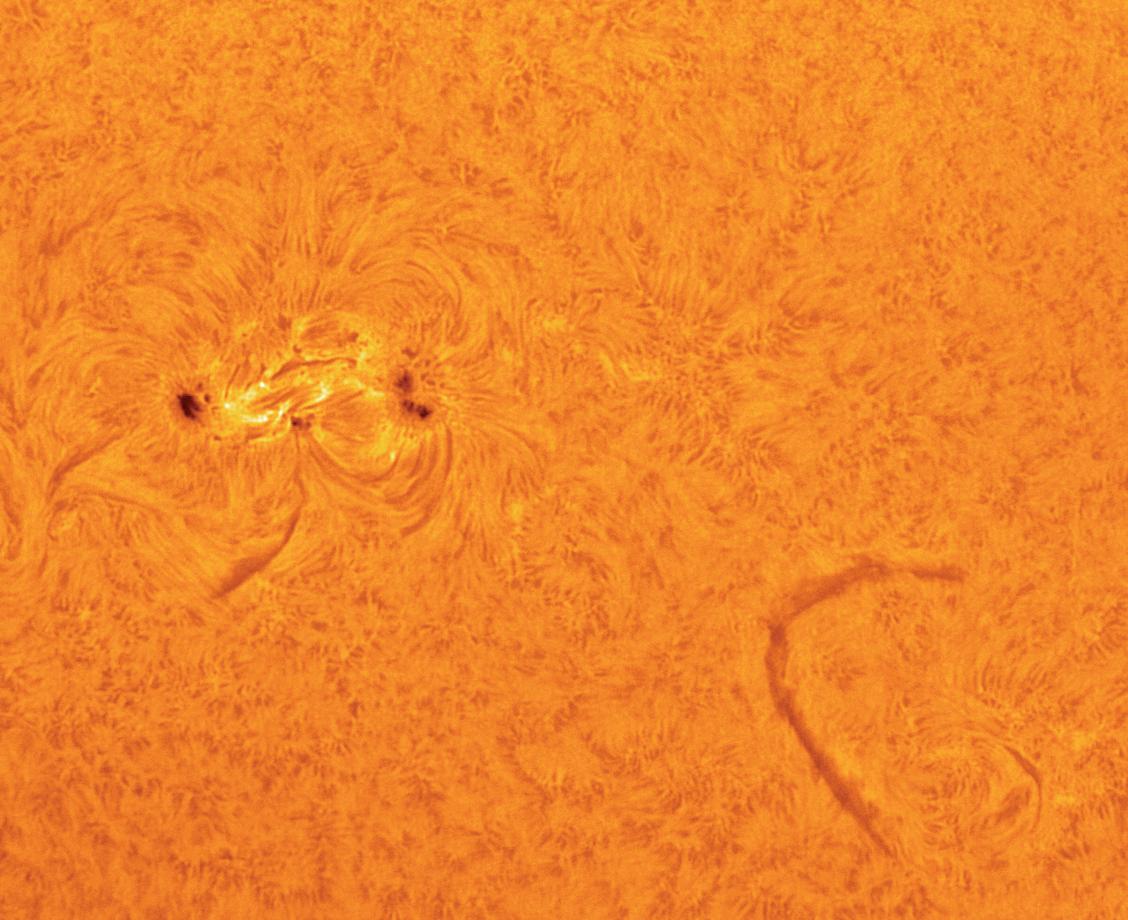 surrounding penumbra is brighter and has a temperature of around 5,500°C Sunspots often come in pairs of opposite magnetic polarity Below is a photo that was taken during our observation It illustrates a solar filament in the bottom right corner, apair of sunspots, and the curling of the sunspots' surroundings with the pattern of their magneticfields.